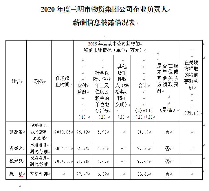 2020年度三明市物資集團(tuán)公司企業(yè)負(fù)責(zé)人薪酬信息披露情況表
